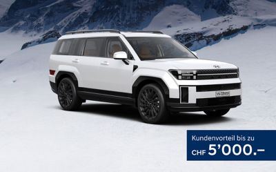 Lagerprämie (Beispiel): SANTA FE (MY26) Vertex Calligraphy 1.6 T-GDi PHEV Swiss Edition 7 P, Energieverbrauch (Fahrbetrieb): 3.8 l/100 km + 11.4 kWh/100 km, Benzinäquivalent (gesamt): 5.1 l/100 km, CO₂-Emissionen (Fahrbetrieb): 87 g/km, CO₂-Emissionen aus der Treibstoff- und/oder Strombereitstellung: 30 g/km, Energieeffizienz-Kategorie: E. Barzahlungspreis: CHF 73'200.–, Listenpreis: CHF 76'700.– (Lagerprämie: CHF 3'500.– + Swiss Edition: CHF 1'770.–). Die Summe (Wert) des Rabatts (Lagerprämie) ist modell- und fahrzeugabhängig. Aktion gültig vom 18.12.2025 bis 28.02.2026 und nur solange Vorrat. Die genannten Angebote gelten nur für Privatkunden und nur bei teilnehmenden Händlern. Alle Beträge inkl. MwSt. Unverbindliche Preisempfehlungen, Preisänderungen vorbehalten.