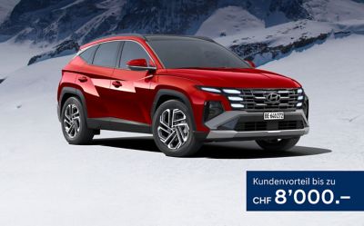 Lagerprämie (Beispiel): TUCSON MY26 PHEV Vertex Sunroof Swiss Edition, Energieverbrauch (Fahrbetrieb): 3.3 l/100 km + 11.2 kWh/100 km, Benzinäquivalent (gesamt): 4.5 l/100 km, CO₂-Emissionen (Fahrbetrieb): 75 g/km, CO₂-Emissionen aus der Treibstoff- und/oder Strombereitstellung: 28 g/km, Energieeffizienz-Kategorie: E. Barzahlungspreis: CHF 56'150.–, Listenpreis: CHF 62'400.– (Lagerprämie: CHF 6'250.– + Swiss Edition: CHF 1'850.–). Die Summe (Wert) des Rabatts (Lagerprämie) ist modell- und fahrzeugabhängig. Aktion gültig vom 18.12.2025 bis 28.02.2026 und nur solange Vorrat. Die genannten Angebote gelten nur für Privatkunden und nur bei teilnehmenden Händlern. Alle Beträge inkl. MwSt. Unverbindliche Preisempfehlungen, Preisänderungen vorbehalten.